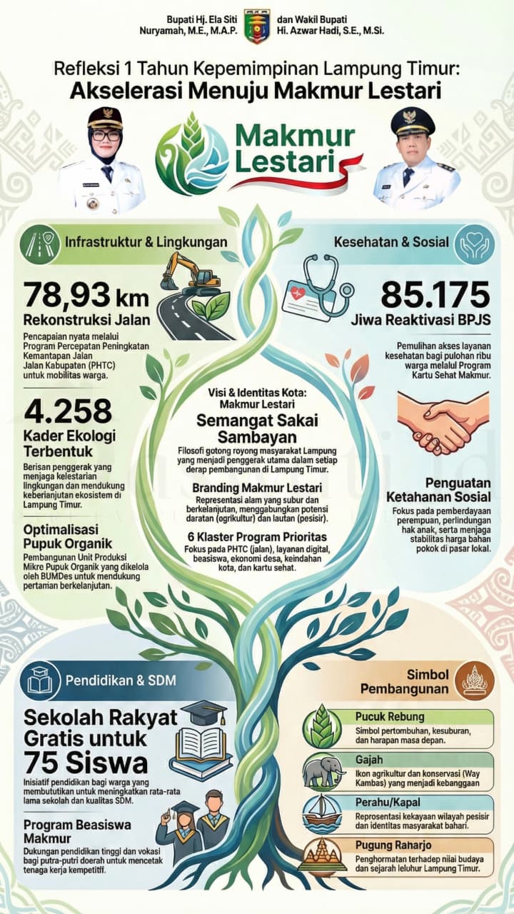 Lampung Timur – Tahun 2025 menjadi tonggak awal transformasi bagi Kabupaten Lampung Timur di bawah nakhoda Hj. Ela Siti Nuryamah dan Hi. Azwar Hadi. Mengusung visi “Lampung Timur Makmur Menuju Indonesia Emas”, kepemimpinan ini tidak hanya bekerja di balik meja, tetapi terjun langsung melakukan akselerasi pembangunan melalui semangat Sakai Sambayan. Dengan tema pembangunan “Akselerasi Pembangunan Infrastruktur dan Pelayanan Publik Berkelanjutan”, tahun pertama ini telah mencatatkan berbagai capaian nyata yang menyentuh urat nadi kehidupan masyarakat. Akselerasi Infrastruktur: Menghubungkan Harapan dan Keamanan Pemerintah daerah menyadari bahwa infrastruktur adalah kunci pertumbuhan ekonomi. Selama tahun 2025, telah dilakukan rekonstruksi jalan kabupaten dan desa sepanjang 78,93 km serta pemeliharaan berkala sepanjang 10,15 km. Kehadiran Unit Reaksi Cepat (URC) juga secara sigap menangani kerusakan jalan sepanjang 710 meter untuk menjamin kelancaran mobilitas warga. Konektivitas antarwilayah semakin diperkuat dengan pembangunan 2 unit jembatan di wilayah Sekampung dan Waway Karya. Di sektor pemukiman, program peningkatan Prasarana, Sarana, dan Utilitas Umum (PSU) telah membangun 31,2 km jalan lingkungan di 52 desa. Untuk keamanan di malam hari, pemasangan Lampu Penerangan Jalan Umum (LPJU) sebanyak 380 unit telah mencapai progres 100%. Selain itu, martabat keluarga miskin ditingkatkan melalui rehabilitasi 171 Rumah Tidak Layak Huni (RTLH). Kesehatan dan Pendidikan: Menenun Generasi Emas Dalam aspek humaniora, kesehatan adalah prioritas mutlak. Pemerintah telah melakukan reaktivasi BPJS bagi 85.175 jiwa, melampaui target awal sebesar 118%.Program inovatif seperti “Gertak Ela TOSS TBC” berhasil menjangkau 1.825 orang untuk mendapatkan pengobatan standar. Untuk menekan angka stunting, program “Canting Star” melakukan skrining kesehatan massal terhadap lebih dari 250.000 anak sekolah dan remaja putri. Di bidang pendidikan, fokus diberikan pada pemerataan sarana belajar. Pemerintah telah membangun 104 ruang kelas baru dan merehabilitasi 136 ruang kelas dari jenjang PAUD hingga SMP. Tak hanya ilmu pengetahuan, kesadaran ekologis juga ditanamkan melalui Sekolah Kader Ekologi yang telah meluluskan 4.258 kader, mulai dari tingkat desa hingga perkantoran. Keadilan Sosial dan Perlindungan Kelompok Rentan Keberpihakan pada kaum marginal terlihat dari program “Sekolah Rakyat” yang memberikan akses pendidikan gratis bagi 75 siswa dari keluarga miskin ekstrem, dengan gedung permanen yang kini tengah dibangun di kompleks Islamic Center Sukadana. Bantuan sosial juga menyasar berbagai lapisan: Pemberian makanan bagi 180 lansia tunggal dan 1.049 korban bencana; Penyediaan alat bantu bagi 20 penyandang disabilitas dan layanan rujukan bagi 48 orang dengan gangguan jiwa (ODGJ); Pembangunan 9 Rumah Sejahtera Terpadu (RST) bagi keluarga miskin dan rentan; Inovasi “Desa Migran Emas” di 20 desa sebagai garda terdepan perlindungan Pekerja Migran Indonesia (PMI). Kedaulatan Pangan dan Ekonomi Berbasis Desa Sebagai daerah agrikultur, Lampung Timur memperkuat ketahanan pangan dengan memberikan bantuan alat mesin pertanian dan pupuk kepada 96 Gapoktan. Dukungan benih sayur disalurkan kepada 10 Kelompok Wanita Tani (KWT) di lokasi stunting, serta bantuan benih jagung dan bibit kakao sambung pucuk kepada belasan kelompok tani lainnya. Pembangunan Rumah Vertikal Dryer bagi kelompok tani juga dilakukan untuk meningkatkan kualitas hasil panen. Digitalisasi dan Identitas Kota Modernisasi pelayanan publik dihadirkan melalui Mal Pelayanan Publik (MPP) dan aplikasi pajak “Sibadak”. Kehadiran Samsat Digital Drive Thru di Mataram Baru dan layanan “Eazy Passport” semakin mempermudah warga dalam mengurus dokumen penting tanpa birokrasi yang rumit. Secara visual, identitas Lampung Timur kini dipertegas melalui city branding “Makmur Lestari”. Logo baru ini memadukan filosofi Pucuk Rebung (pertumbuhan), Gajah (ikon daerah), dan situs budaya Pugung Raharjo, yang mencerminkan harmoni antara alam, manusia, dan budaya. Menuju 2026: Hasil Terbaik Cepat Memasuki tahun kedua, duet Ela-Azwar telah menyiapkan 6 Klaster Program Prioritas melalui instrumen “Hasil Terbaik Cepat”. Program ini mencakup beasiswa makmur, pengembangan kawasan ekonomi desa, hingga mempercantik kawasan ibu kota (City Beautification). Dengan fondasi kuat yang diletakkan pada tahun 2025, Lampung Timur kini bergerak mantap menuju masa depan yang maju, aman, dan berkelanjutan. Navigasi pos Bupati Lampung Timur tinjau pekerjaan jalan Rp.40 miliar