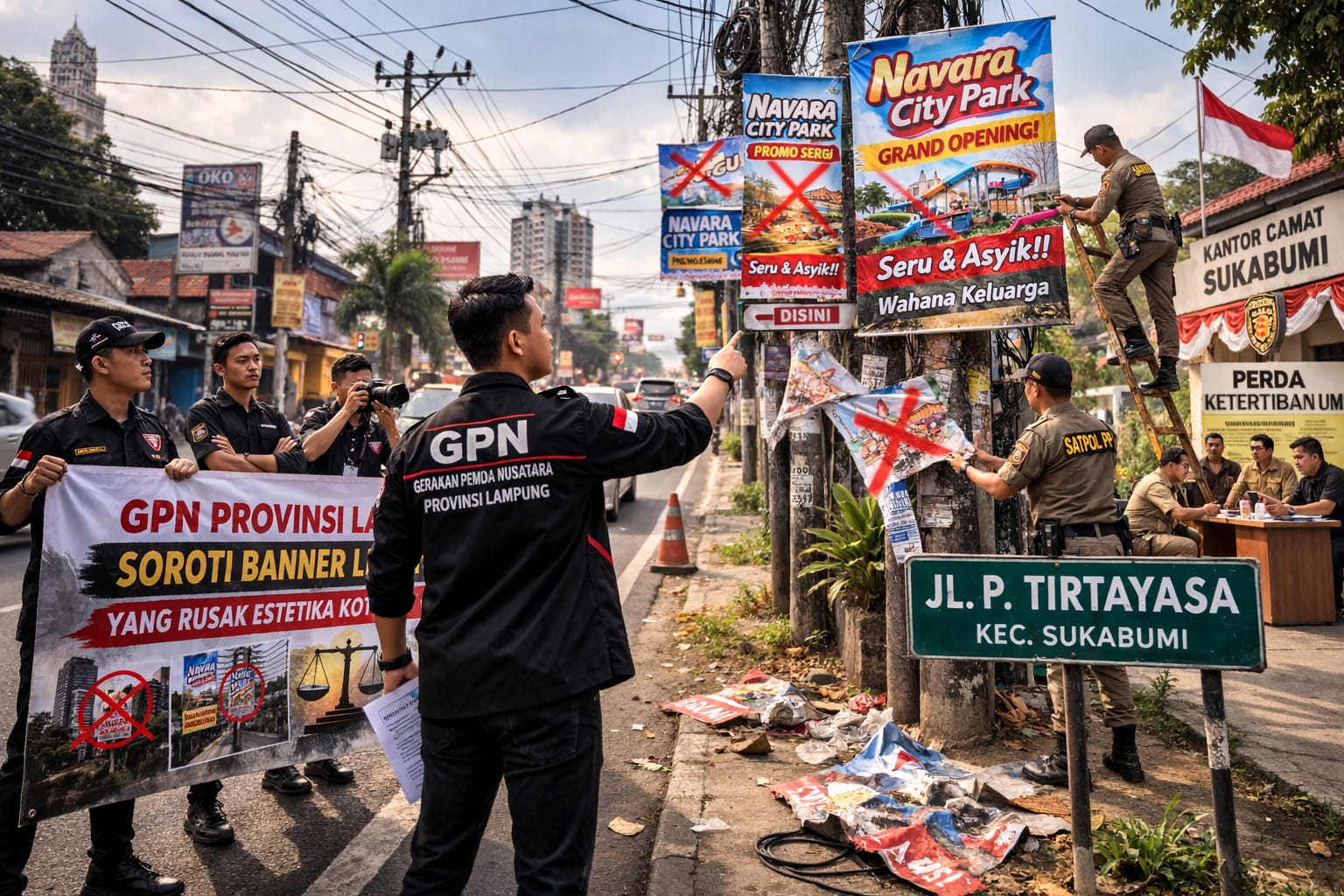 Bandar Lampung – Pemasangan sejumlah banner promosi Navara City Park di ruas Jalan Pangeran Tirtayasa, Kecamatan Sukabumi, mendadak menjadi sorotan. Banner yang dipasang di sejumlah tiang listrik itu diduga kuat melanggar Peraturan Daerah (Perda) tentang Ketertiban Umum karena mengganggu estetika kota .